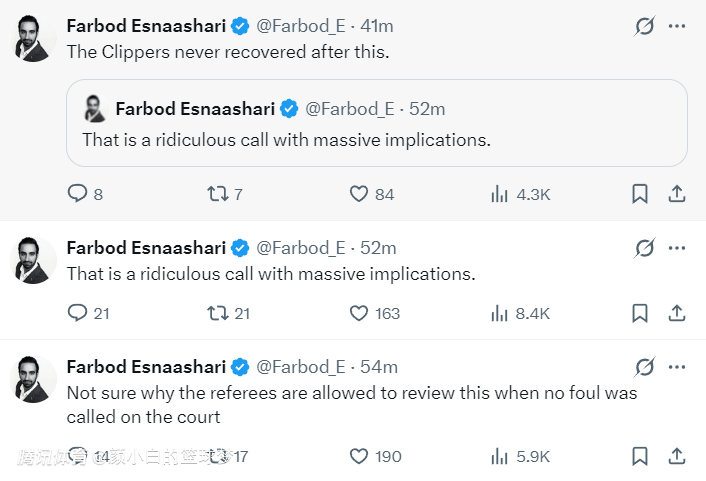裁判在没有哨子的情况下主动看回放给哨引发了快船记者Farbod Esnaashari的不满,他表示:我完全不明白裁判在没有响哨的情况下看回放是什么意思,这明显是一个违规的行为,那是一个荒谬的决定,而且影响是极其深远的。
