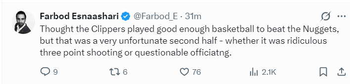 赛后船记Farbod Esnaashari继续吐槽,尽管快船队的整体表现还算不错但还是没能击败掘金,无论是球队一波荒诞的三分出手还是裁判那令人窒息的吹罚尺度。