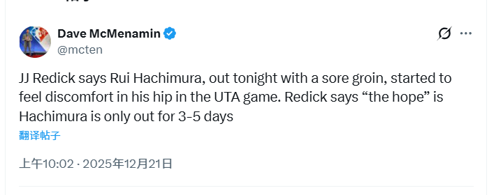 雷迪克透露,因腹股沟酸痛缺战今晚比赛的八村垒,是在对阵犹他爵士的比赛中开始出现臀部不适症状的。雷迪克表示,希望八村垒的休战时间仅为3-5天。