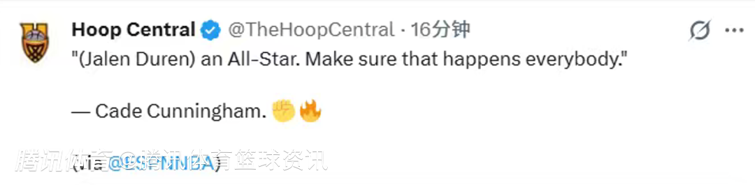 谈到队友杜伦,坎宁安表示:“杜伦是全明星级别的球员。大家伙儿行动起来,一定要确保他入选。”杜伦在本场比赛出战29分钟,得到21分13篮板3助攻1抢断。