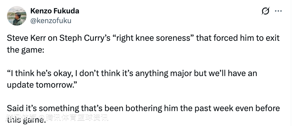 谈及因为膝盖酸痛而退出比赛的库里,科尔表示:“我觉得他没事,伤势并不严重,但我们明天会有最新消息。这个问题在本周、甚至在这场比赛之前就一直困扰着库里。”本场比赛,库里右膝酸痛提前离场,伤退前他拿到23分1篮板2助攻。