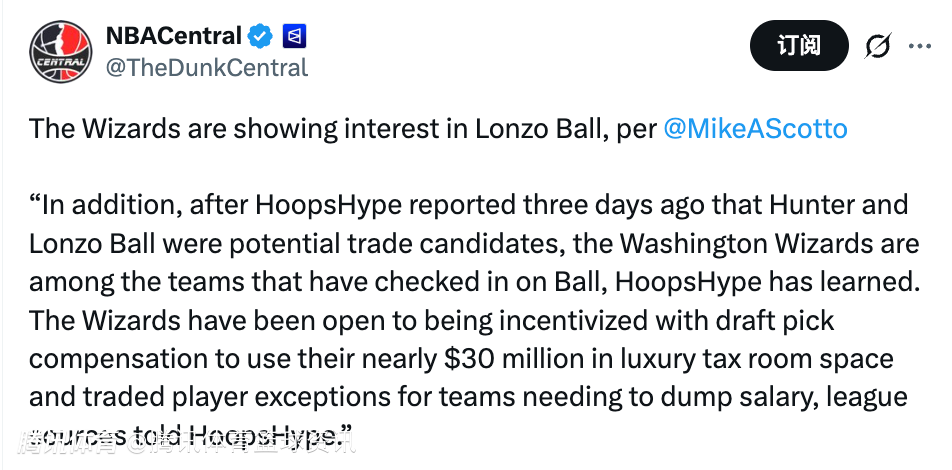 Scotto表示:“华盛顿奇才已成为询价鲍尔的球队之一。联盟消息人士称,奇才手握近3000 万美元的奢侈税空间与交易球员特例,愿意通过接收其他球队想要清理的薪资合同,换取选秀权作为补偿。”