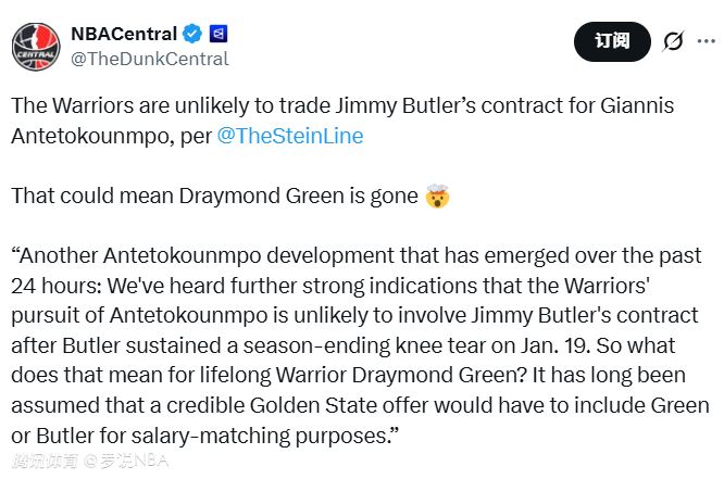 该报道提到:“过去24小时里,关于字母哥交易又有了新动向:我们进一步获悉,由于巴特勒在1月19日遭遇导致赛季报销的膝伤,勇士队在追逐字母哥的过程中,大概率不会将巴特勒的合同纳入交易方案。那么,对于效力勇士生涯从未离队的德雷蒙德-格林而言,这意味着什么?外界一直以来的共识是,勇士若想拿出一份有诚意的报价,就必须将格林或巴特勒加入交易,以满足薪资匹配的要求。”