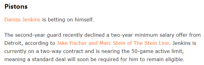 北京时间2月1日,据名记Marc Stein和Jake Fischer报道,二年级后卫詹金斯近期拒绝了活塞队开出的一份两年底薪合同。