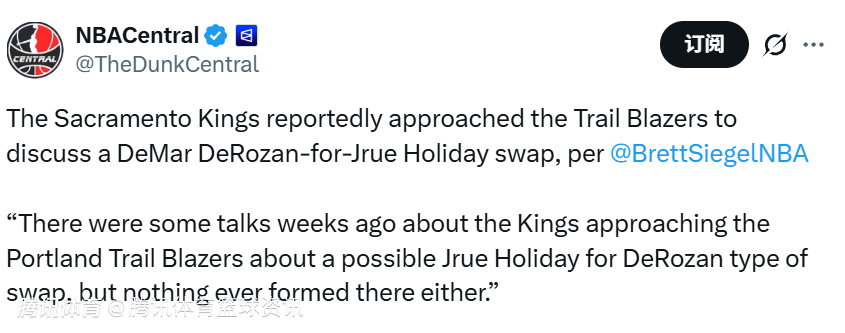 北京时间2月1日,据记者Brett Siegel报道,国王队已接洽开拓者队,商讨用德罗赞交易霍勒迪的方案。