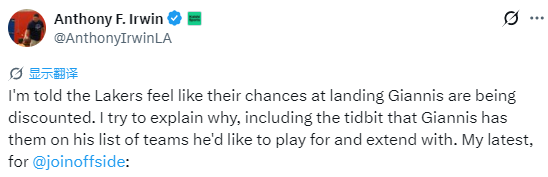 北京时间2月1日,据记者Anthony Irwin报道,湖人认为外界低估了他们得到字母哥的可能性。