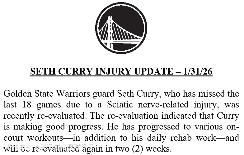 北京时间2月1日,勇士官方发布公告,宣布因坐骨神经相关伤势已连续缺阵18场比赛的球队后卫小库里,近期接受伤情复查。复查结果显示,小库里恢复进展良好。除日常康复训练外,他已开始进行多种场上训练,将在两周后再次接受伤情评估。