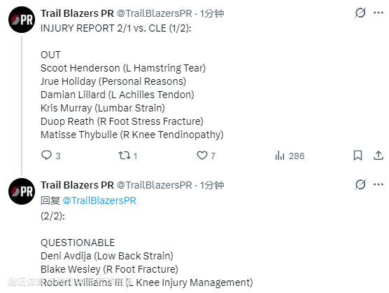 北京时间2月1日,NBA常规赛继续进行,开拓者明日对阵骑士。赛前,开拓者方面公布本场比赛最新伤情报告,布莱克-韦斯利升级为出战成疑。斯库特-亨德森仍将缺阵,阿夫迪亚、罗威出战成疑。
