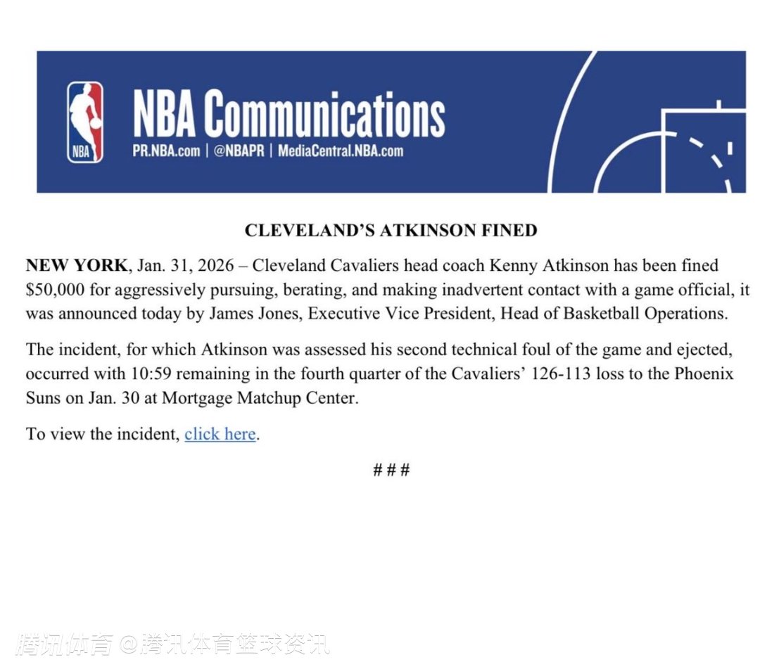 北京时间2月1日,NBA官方公布罚单,克利夫兰骑士队主教练肯尼-阿特金森因强行逼近、斥责比赛裁判,且与裁判发生无意身体接触,被处以5万美元罚款。该事件发生于1月31日骑士113-126不敌太阳队的比赛中,第四节还剩10分59秒时。阿特金森因此吃到本场个人第二次技术犯规,并被驱逐出场。详情稍后。