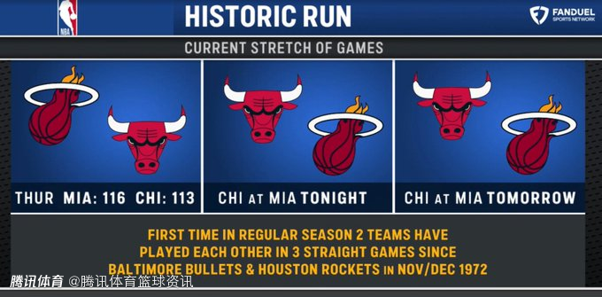 北京时间2月1日,NBA常规赛继续进行,公牛对阵热火。比赛进行过程中,赛事转播方公布一组有趣的数据,根据统计显示,这是自1972年11月至12月的巴尔的摩子弹队与休斯顿火箭队之后,NBA常规赛首次出现两支球队连续三次交手的情况。