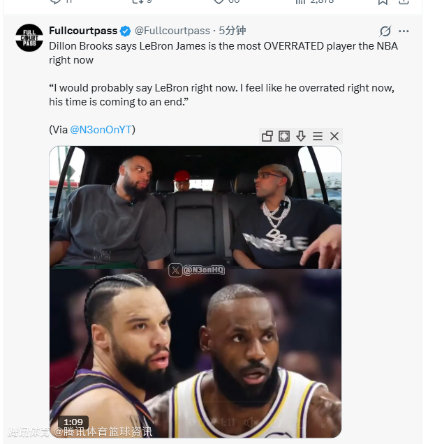 北京时间2月1日,太阳球星狄龙-布鲁克斯在接受采访时表示,他认为詹姆斯是目前NBA最被高估的球员。