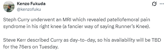 北京时间2月1日,勇士当家球星库里的伤情更新,据勇士记者Kenzo Fukuda报道,勇士对库里的膝盖进行了核磁共振检查,右膝确诊为髌股关节疼痛综合征(跑步膝),进入球队伤病名单,目前被列为每日观察状态。