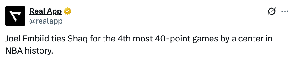 本场比赛,恩比德首发出战39分钟,投篮27中13,三分球5中3,拿到40分11篮板4助攻1抢断2盖帽,正负值+16为全队最高,这40分是他赛季新高,同时也是他自2024年季后赛以来首次单场拿到40+。