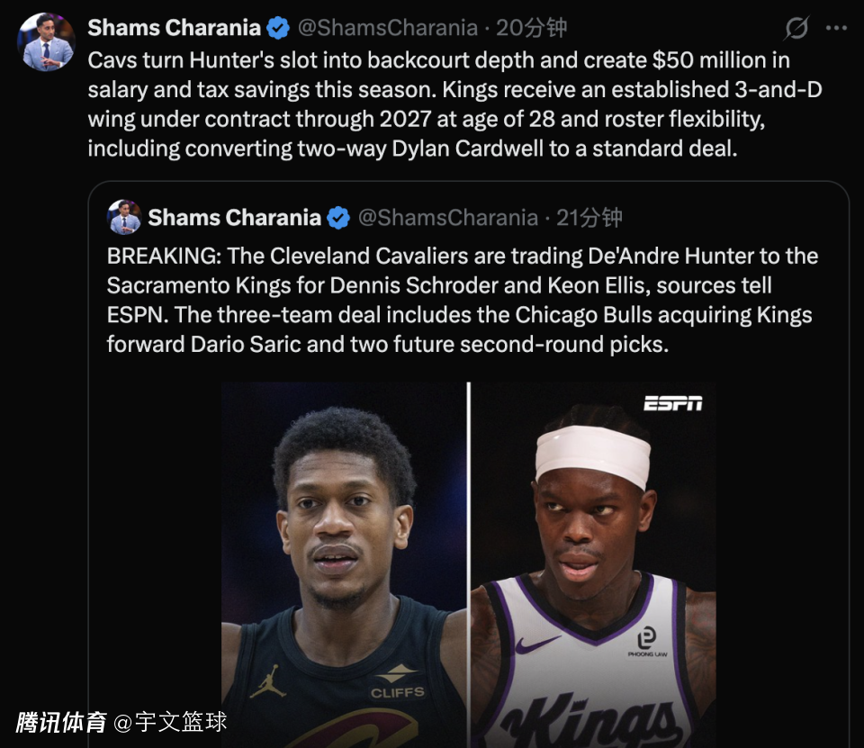 北京时间2月1日,据名记Shams报道,骑士队将德安德烈-亨特交易至国王,换来丹尼斯-施罗德和基翁-埃利斯,这笔交易还包括第三方公牛,公牛获得国王前锋达里奥-萨里奇和2个未来的次轮选秀权。施罗德将会迎来职业生涯所效力的第11支队伍。