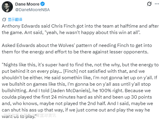 当被问及森林狼队似乎总需要芬奇的严厉鞭策,才能在对阵实力较弱的对手时拿出应有的活力和拼劲这一现象时,爱德华兹回应:“像这样的夜晚,真的很难找到,不是说找不到理由,而是很难在每一个回合都全情投入。芬奇对此很不满意,我们也不该满意。他大概是这么说的:‘我不会对你们手下留情。如果你们在这种比赛里敷衍了事,我就会一直盯着你们,直到你们不再混日子。’我跟麦克丹尼尔斯说,他说的百分之百对。因为我们本可以在前24分钟拼尽全力,领先对手30分,那样的话,说不定下半场都不用打了。我还说,如果我们一上来就按他要求的方式去打,或许就能让他闭嘴了。”