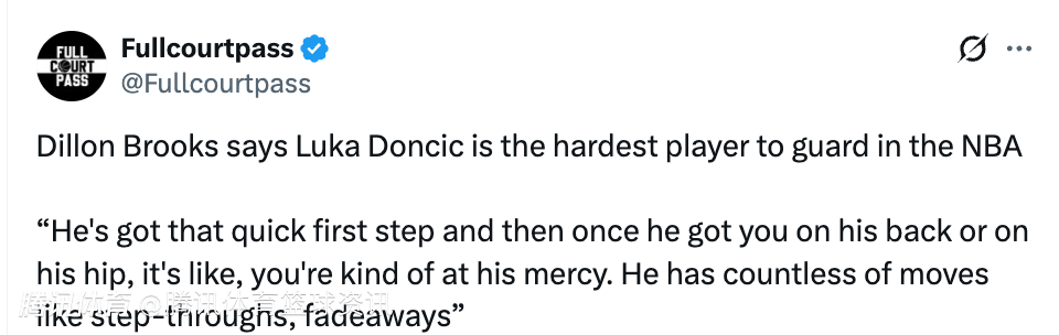北京时间2月1日,近日,狄龙-布鲁克斯在接受采访时表示,东契奇是NBA里最难防守的球员。