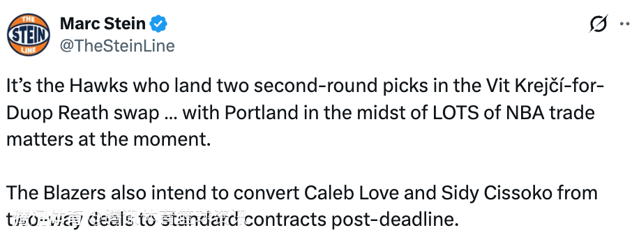 据名记Stein跟进报道,开拓者队还计划在交易截止日后,将凯莱布-乐福与西索科的双向合同转为正式合同。
