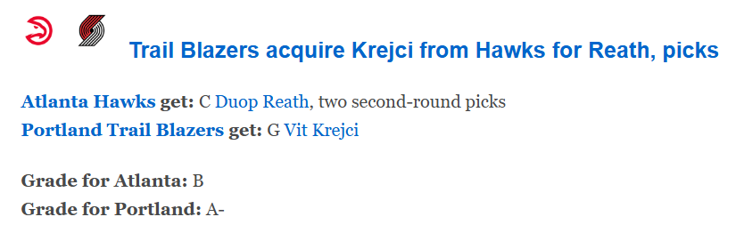北京时间2月2日,开拓者和老鹰完成了一笔3换1的交易。开拓者送出已经赛季报销的里斯以及两个次轮签(原属于老鹰的2027年次轮签以及尼克斯的2030年次轮签),从老鹰得到射手克雷伊奇。ESPN随后对这笔交易进行评级,开拓者评级是A-,老鹰是B。
