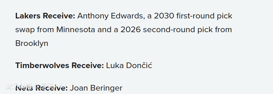 湖人得到:爱德华兹、森林狼2030年首轮签互换权、篮网2026年次轮签