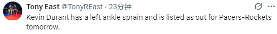 北京时间2月2日,NBA常规赛继续进行,火箭明日对阵步行者。赛前,火箭方面透露本场比赛伤情报告,其中,杜兰特遭遇左脚踝扭伤,已被列入本场比赛的缺阵名单。