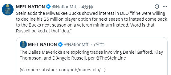 Stein补充表示,雄鹿队曾对拉塞尔表达了兴趣,但前提是“他愿意放弃下赛季价值600万美元的球员选项,转而以老将底薪合同在下赛季重返雄鹿”。消息称,拉塞尔拒绝了这一提议。