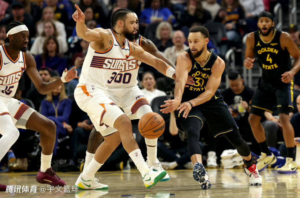 末节比赛,库里携手桑托斯连续飙进三分,勇士一度拉开分差到双位数。太阳在布克的带领下试图缩小分差,但是库里用中距离投篮还以颜色,比赛最后时刻成为了库里和布克的巨星对飙舞台,太阳在最后时刻顽强地缩小分差到2分。