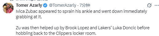 从慢动作回放来看,当时祖巴茨与队友进行挡拆配合,接球后抛投不中,而他在落地后,踩到了詹姆斯的脚上。祖巴茨痛苦倒地,随后也没有参与快船队的回防,裁判叫停比赛之后,东契奇从前场跑回来询问祖巴茨伤情,之后与大洛佩兹一起将祖巴茨搀扶起来。