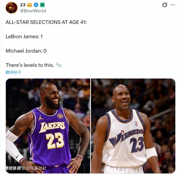 湖人媒体、詹姆斯媒体BronWorld对比了41岁时入选全明星次数:詹姆斯1、乔丹0(41岁时已退役)。并写道:“不是一个级别!”