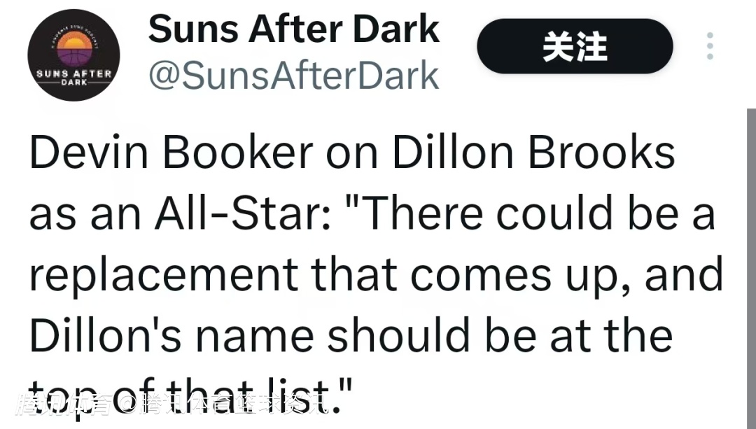 布克在谈及狄龙-布鲁克斯的全明星资格时说道:“如果后续有补选名额,狄龙的名字理应排在榜首。”