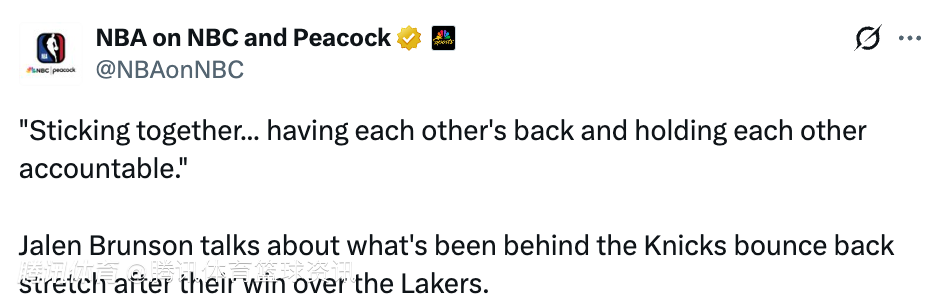 被问及自己觉得这支纽约尼克斯目前的状态核心是什么,布伦森表示:“我觉得最重要的就是团结一心、彼此支持、互相督促、共同担责。这个时段能打出这样的表现真的很棒。”