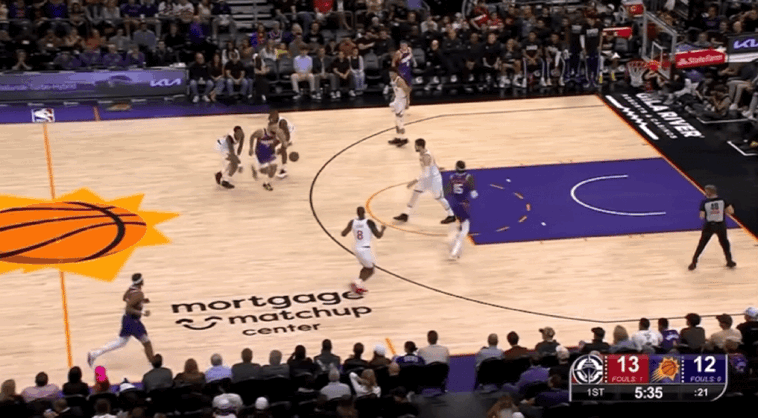 次节比赛开始,乔丹-米勒抛投打进,快船延续进攻高潮到15-2,双方分差来到双位数。狄龙急停跳投为太阳止损,阿伦三分命中,科林斯反手上篮,奥尼尔和狄龙连续飙进三分。太阳打进12-2的进攻高潮抹平分差,邓恩打进2+1,狄龙2罚1中,桑德斯基廷跳投,