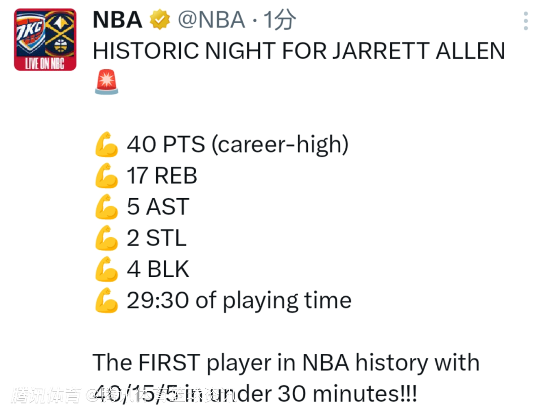 此役艾伦首发出战29分钟,投篮23中16,轰下40分17篮板5助攻2抢断4盖帽,且没有失误,其中得分创下生涯新高。他是NBA历史上首位在30分钟以内拿到40+15+5的球员,另外也是NBA历史上首位单场拿到40+15+5且0失误的球员。