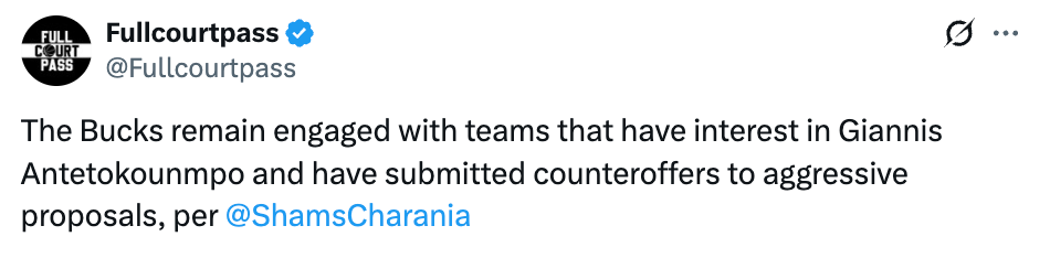 Shams表示:“周末期间,雄鹿队持续与那些表现出浓厚兴趣并给出积极报价的NBA球队保持沟通。我的了解是,他们也针对这些积极的报价给出了还价。”