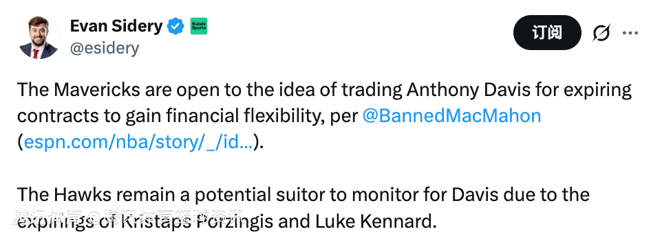 此前名记Shams曾表示,独行侠在交易截止日前正积极听取关于安东尼-戴维斯的报价。亚特兰大老鹰和多伦多猛龙可能是潜在的交易对象,但独行侠也可能选择等到赛季结束后再做决定。