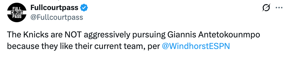 北京时间2月3日,据ESPN名记文霍斯特报道,尼克斯队并没有积极追逐字母哥,因为他们很满意目前的球队阵容。