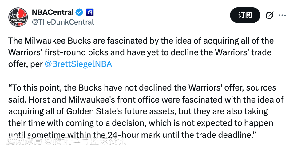 北京时间2月3日,据美记Brett Siegel报道,密尔沃基雄鹿队对获得勇士队所有首轮选秀权的想法非常感兴趣,并且尚未拒绝勇士队的交易报价。