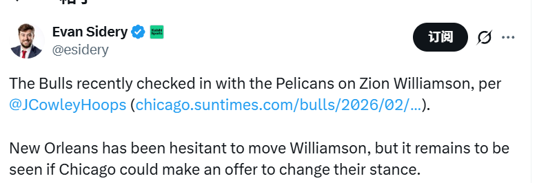 北京时间2月3日,据记者Joe Cowley报道,公牛近期就锡安的交易事宜与鹈鹕进行了沟通。鹈鹕此前一直不愿放走锡安,但公牛能否开出足以改变其立场的报价,仍有待观察。