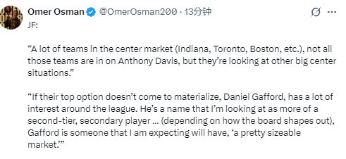 “如果球队的首要引援目标未能实现,加福德会成为联盟各队的热门选择。在我看来,他属于二线备选球员,这最终取决于市场形势,但我预计加福德的交易市场会相当可观。”