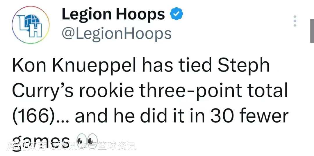 值得一提的是,克努佩尔的新秀三分命中数已追平斯蒂芬-库里的纪录,而他比库里少用了30场比赛就达成了这一成就。