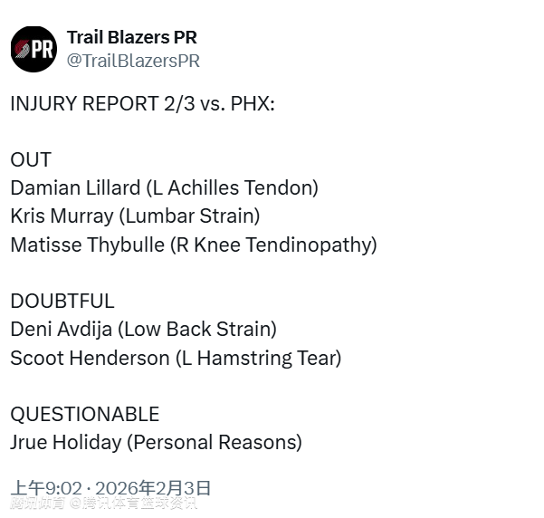确认缺阵:利拉德(跟腱伤势)、克里斯-穆雷(腰部拉伤)、赛布尔(右膝肌腱病变)