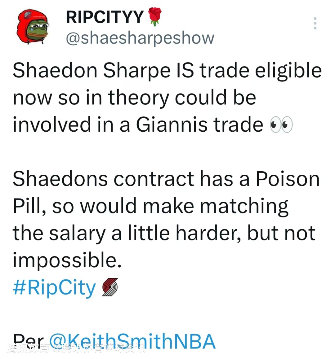 北京时间2月3日,根据记者Keith Smith的报道,开拓者球员谢登-夏普如今已具备交易资格,理论上可被纳入开拓者追字母哥的交易报价方案中。