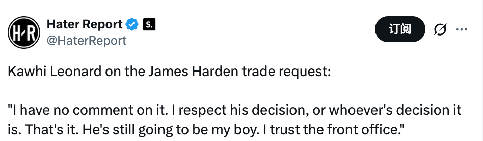 有记者表示,哈登有可能在交易截止日前被送走,这对你来说算不算意外,你之前有没有听过相关消息,小卡表示:“这确实有点意外,但对此我不予置评,我尊重他的决定,或者说尊重相关各方的决定,仅此而已,他永远是我的兄弟,我相信球队管理层。”