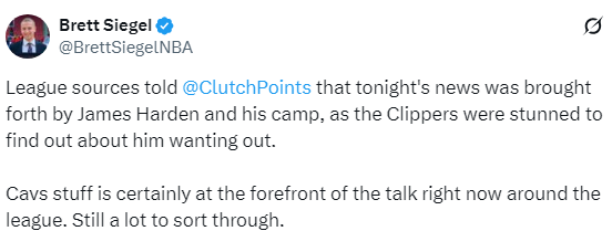名记Siegel补充报道,消息源透露,是哈登和哈登的团队向快船提出了离队想法,快船很震惊但他们同意了;船记Tomer Azarly则报道,哈登与快船寻找交易已经好几个星期了!