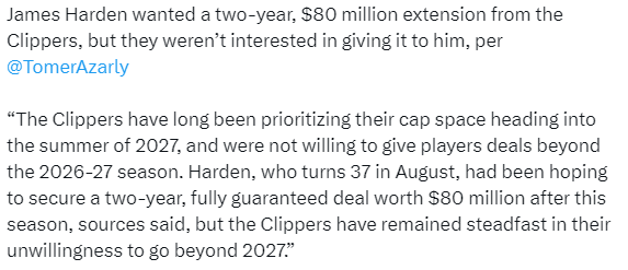Tomer Azarly还报道,哈登曾向快船索要一份两年8000万美元的续约合同,但球队对此并无兴趣;快船长期以来一直优先考虑2027年夏天的薪资空间,不愿给出超过2026-27赛季的合同。消息人士称,今年8月将满37岁的哈登本希望在本赛季后获得一份两年全额保障的8000万美元合约,但快船坚持不愿让合同期限跨越2027年。