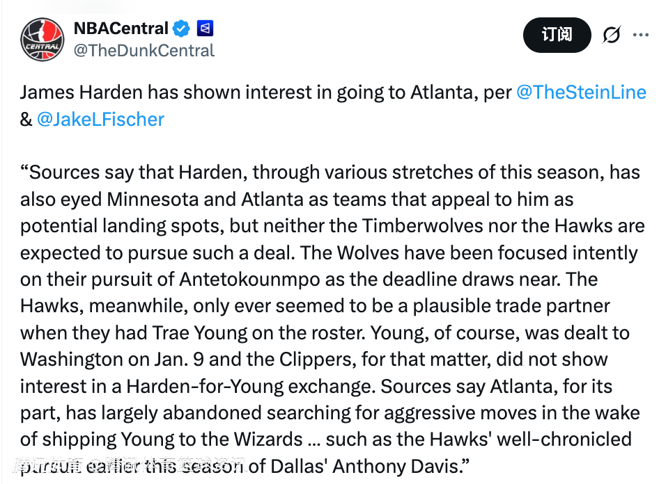 北京时间2月3日,据名记Stein和Jake Fischer联合报道,哈登已表达出对加盟亚特兰大老鹰队的兴趣。