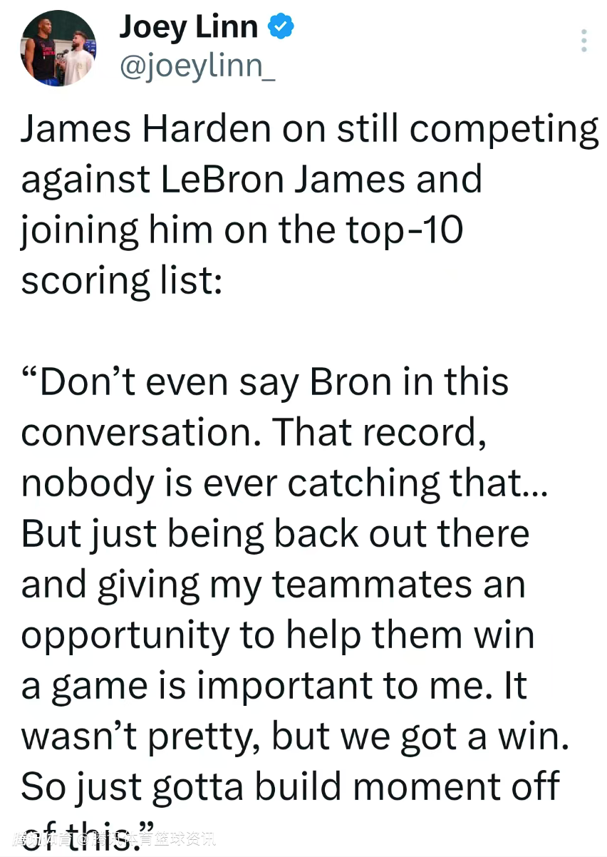 哈登在谈到生涯总得分跻身历史前十,且仍与詹姆斯同场竞技一事表示:“别在这儿提詹姆斯,他的纪录,没人能打破。能重返赛场,为队友创造赢球机会,这对我才最重要。这场赢得虽不亮眼,但好歹拿下了胜利,接下来要趁热打铁,把势头延续下去。”