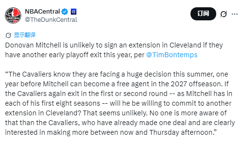 Bontemps表示:“骑士管理层清楚,今年夏天他们将面临一个重大抉择——米切尔2027年休赛期成为自由球员的前一年。如果骑士再度止步季后赛首轮或次轮(这也是米切尔生涯前8个赛季的季后赛结局),他还会愿意留在骑士续约吗?可能性微乎其微。骑士对此心知肚明,球队已经完成了一笔交易,且显然打算在交易截止日前推进更多运作。”