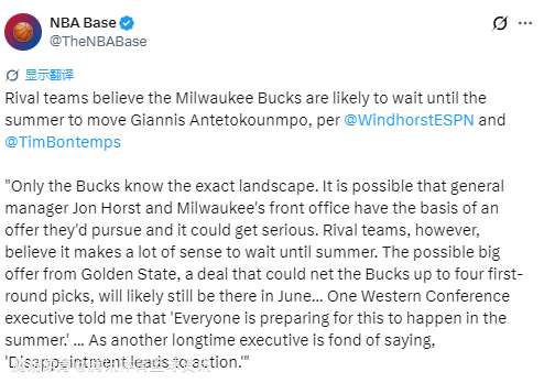 北京时间2月3日,据ESPN记者Windhorst与Bontemps报道,竞争对手球队普遍认为,雄鹿大概率会等到今夏再交易字母哥。