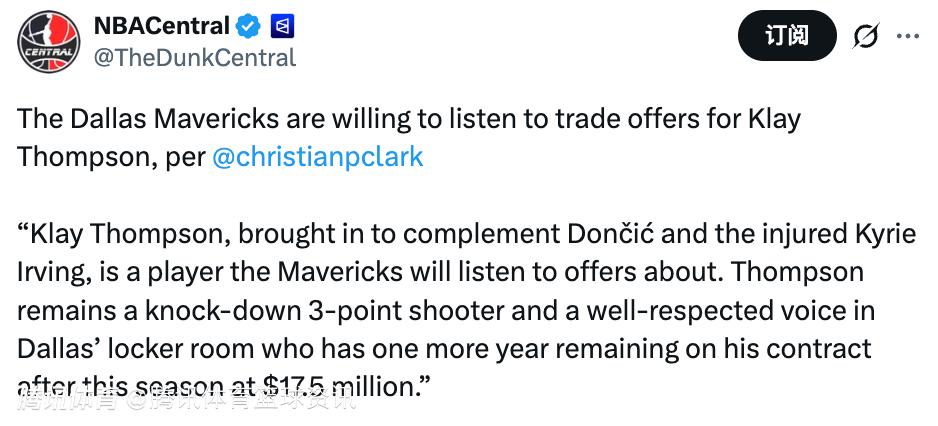 Clark表示:“作为用来辅佐东契奇和受伤的欧文的引援,克莱-汤普森现在成了独行侠愿意为其听取报价的球员。汤普森仍是一位顶级的三分射手,在独行侠的更衣室里也备受尊重。他的合同在本赛季结束后还有一年,薪资为1750万美元。”