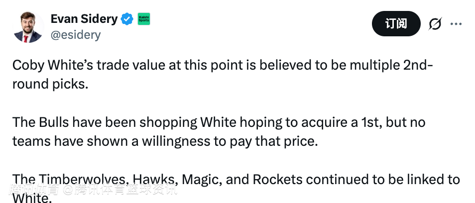 北京时间2月4日,据美记Evan Sidery报道,目前,科比-怀特的交易价值被认为是多个次轮选秀权。